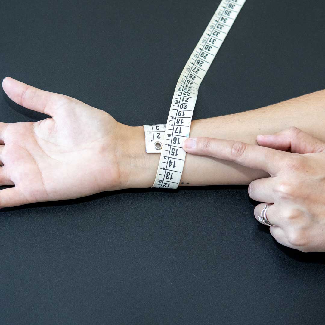 Usa una cinta métrica flexible. Con la palma abierta y mirando hacia arriba, enrolla la cinta métrica alrededor de tu muñeca. Anota la medida de tu muñeca.