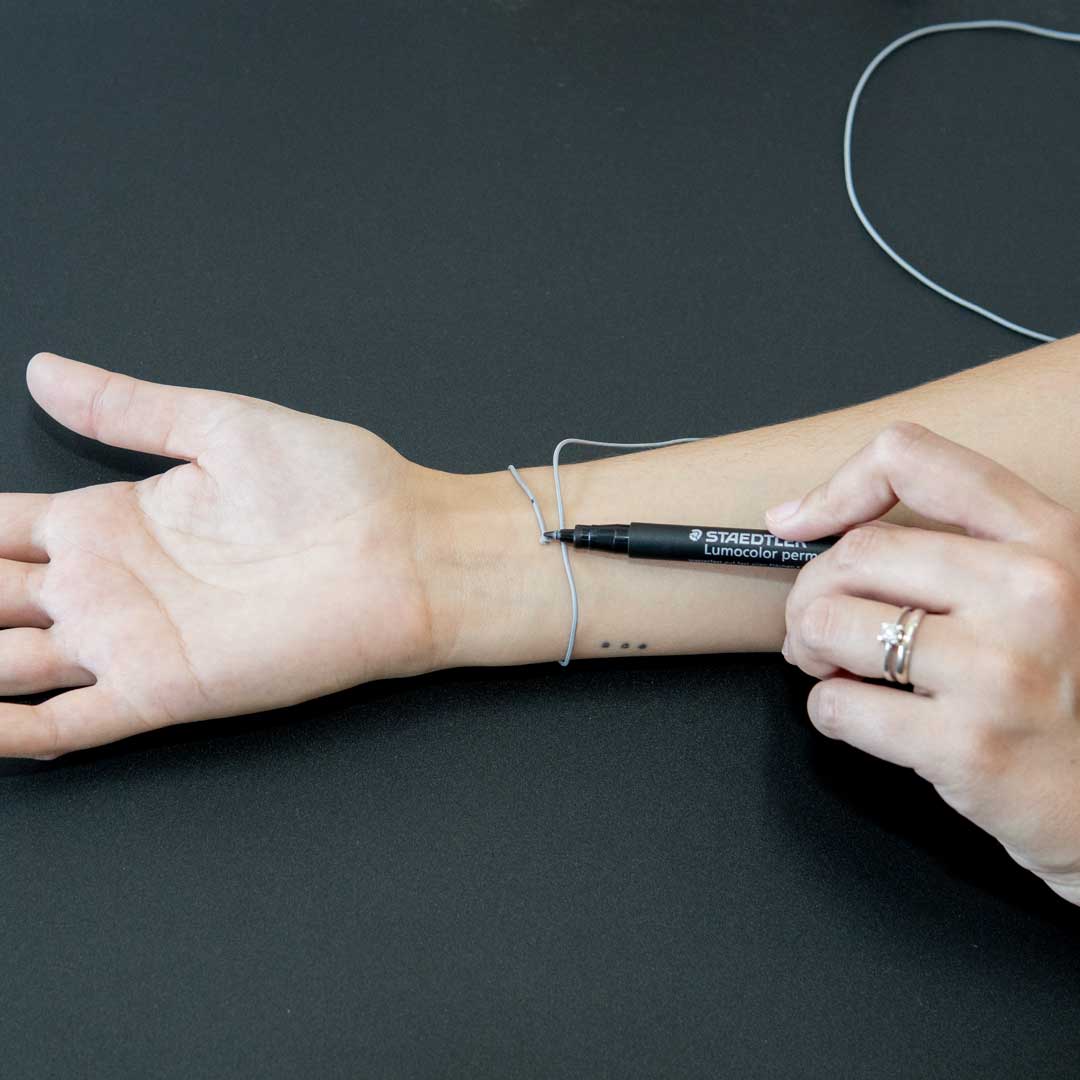 Usa una cuerda.Con la palma abierta y mirando hacia arriba, enrolla la cuerda alrededor de la muñeca. Marca el punto en el que se unen los extremos con un bolígrafo. Luego, coloca la cuerda sobre una superficie plana y mide hasta la marca para determinar el tamaño de tu muñeca. Anota la medida.