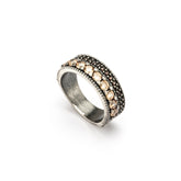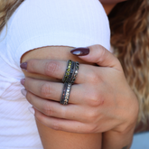 Versátil y atemporal, así es este anillo. Un anillo de 7mm de ancho lleno de detalles formado por dos hileras de circonitas y piedras semipreciosas de diferentes tamaños que te atrapará por su luz. Combínalo con tus favoritos y dale un toque único a cualquier look.