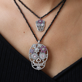 Entre el recuerdo y la eternidad, la Catrina se alza como joya de identidad y poder. Una cadena de bolas de ónix de la que cuelga una catrina con una corona de flores con circonitas engastadas y en los ojos dos ojos de gato rosa. Una pieza que te enamorará por sus colores y su misticismo.