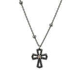 La cruz, símbolo eterno de misterio y fuerza, se transforma en joya para desafiar el tiempo. Una cadena de plata con bolas con baño de rutenio de la que cuelga una silueta de cruz repleta de circonitas que te cautivará por su luz y sus formas. Un colgante perfecto para combinar y elevar cualquier look.