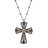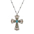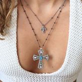 La cruz, símbolo eterno de misterio y fuerza, se transforma en joya para desafiar el tiempo. Una cadena de plata con bolas con baño de rutenio de la que cuelga una cruz XL con una piedra semipreciosa de 6x8mm en el centro y repleta de circonitas y más piedras semipreciosas alrededor. Un colgante perfecto para elevar cualquier look.