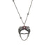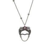 Frida, icono de arte y libertad, convertida en joya que celebra la fuerza de lo único. Una cadena de plata de bolas con baño de rutenio de la que cuelga la silueta de la cara de Frida Kahlo con el pelo lleno de flores y repleta de circonitas y espinelas que le dan un toque único. Una pieza única que aportará un toque mágico a cualquier look.