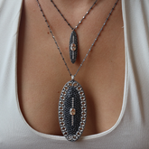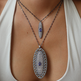 Fuerza y elegancia convergen para crear este colgante. Una cadena de plata con baño de rutenio de la que cuelga una piedra semipreciosa central rodeada de pavé de piedras semipreciosas. Alrededor de la pieza, una orla de flores de plata acaba de darle el toque mágico. Un colgante que te dejará sin aliento.