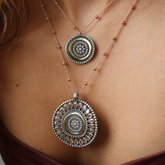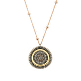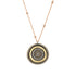 Elegante y con mucho carisma, así es este colgante. Una cadena de plata con baño de oro rosa y bolas de la que cuelga una pieza central con dos orlas de circonitas y un aro de bronce que le acaba de dar a la pieza un toque único. Combínalo con tus favoritos y crea looks sin igual.