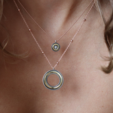 Versatilidad, sutileza y elegancia convergen en este colgante. Una cadena de plata con baño de oro rosa y bolas de la que cuelga un aro de bronce con una circonita en el centro. Perfecto para combinar con tus favoritos y elevar todos tus looks de la temporada.