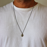 Más que joyas, símbolos de carácter. Así nace ICON: Joyas para él y para ella. Una cadena rolo de plata con baño de rutenio de la que cuelga una circonita verde en forma de gota que le da un toque de color único. Un colgante atrevido y con mucho carisma perfecta para elevar cualquier look.