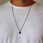 Más que joyas, símbolos de carácter. Así nace ICON: Joyas para él y para ella. Una cadena rolo de plata con baño de rutenio de la que cuelga una piedra semipreciosa granate rectangular que le da un toque de color único. Un colgante atrevido y con mucho carisma perfecta para elevar cualquier look.