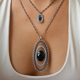 Elegante y súper combinable, así es este colgante. Una cadena de plata con baño de rutenio de la que cuelga una piedra semipreciosa de 6x8mm con una orla ovalada de circonitas a su alrededor que le da un toque de luz único a la pieza. Déjate enamorar por todos sus detalles y combínalo con tus favoritos.