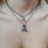 Como la grulla de papel japonesa, esta joya encierra un deseo de paz, amor y prosperidad. Una cadena de plata con baño de rutenio de la que cuelga la silueta de una pajarita de plata repleta de circonitas y con una piedra semipreciosa en el centro que acaba de darle un toque único a la pieza.