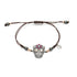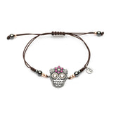 Entre el recuerdo y la eternidad, la Catrina se alza como joya de identidad y poder. Una pulsera de nylon marrón con bolas bañadas en oro rosa y hematites y con una catrina con una corona de flores con circonitas engastadas y en los ojos dos ojos de gato rosa. Una pieza que te enamorará por sus colores y su misticismo.