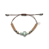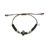 La cruz, símbolo eterno de misterio y fuerza, se transforma en joya para desafiar el tiempo. Una pulsera de nylon marrón con bolas de bronce y hematites con una cruz hecha de resina marmolada en el centro como protagonista que te cautivará por su fuerza y sus detalles. Perfecta para darle un toque único a cualquier look.