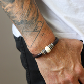 Más que joyas, símbolos de carácter. Así nace ICON: Joyas para él y para ella. Una pulsera de cuero marrón 8mm con una piedra semipreciosa en el centro como protagonista y entrepiezas de plata y bronce repletas de detalles y circonitas. Una pulsera atrevida y perfecta para combinar y elevar cualquier look.