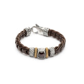 Más que joyas, símbolos de carácter. Así nace ICON: Joyas para él y para ella. Una pulsera de cuero marrón trenzado de 10mm con una piedra granate rectangular en el centro como protagonista y entrepiezas de plata y bronce que le dan un toque único. Una pieza atrevida y perfecta para combinar y elevar cualquier look.