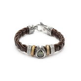 Más que joyas, símbolos de carácter. Así nace ICON: Joyas para él y para ella. Una pulsera de cuero marrón trenzado de 10mm con una circonita verde en forma de gota en el centro como protagonista y entrepiezas de plata y bronce que le dan un toque único. Una pieza atrevida y perfecta para combinar y elevar cualquier look.