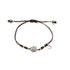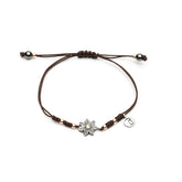 Frida, icono de arte y libertad, convertida en joya que celebra la fuerza de lo único. Una pulsera de nylon marrón con bolas de plata con baño de oro rosa y hematites con una flor en el centro como protagonista repleta de detalles de plata y una circonita cava en el centro. Una pieza delicada y llena de color perfecta para combinar con tus favoritos.