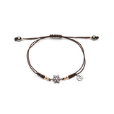 Frida, icono de arte y libertad, convertida en joya que celebra la fuerza de lo único. Una pulsera de nylon marrón con bolas de plata con baño de oro rosa y hematites con una flor en el centro como protagonista repleta de circonitas lilas y una circonita cava en el centro. Una pieza delicada y llena de color perfecta para combinar con tus favoritos.