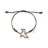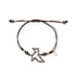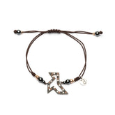 Como la grulla de papel japonesa, esta joya encierra un deseo de paz, amor y prosperidad. Una pulsera de nylon marrón con bolas de plata bañadas en oro rosa y hematites y en el centro, como protagonista, la silueta de una pajarita de plata repleta de circonitas de diferentes colores que le da un toque divertido y único a la pieza.