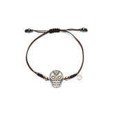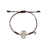 Súper combinable y con mucho carisma, así es esta pulsera. Una pulsera de nylon marrón con bola de 3mm bañadas en oro rosa y hematites con la silueta de una calavera en el centro con ojos de corazón de circonitas y orlas bronce y un corazón de circonitas en la frente. Como un primer beso, así es nuestra Lovers Collection. Descúbrela.