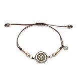Elegante, con mucho carisma y con mucha luz, así es esta pulsera. Una pulsera de nylon con bolas de plata bañadas en oro rosa, perlas y circonitas pera con un motivo repleto de circonitas en el centro como protagonista con una orla de bronce. Una combinación que te cautivará por su originalidad y su luz.