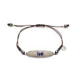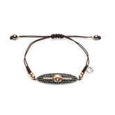 Fuerza y elegancia convergen para crear esta pulsera. Una pulsera de nylon con bolas de plata bañadas en oro rosa y hematites con una piedra central de 6x8mm en el centro rodeada de un pavé de circonitas que te cautivará por su luz y colores. Una pulsera perfecta para lucir con tus mejores looks de la temporada.