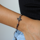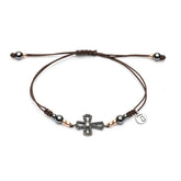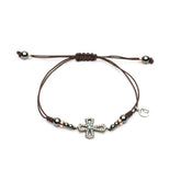 La cruz, símbolo eterno de misterio y fuerza, se transforma en joya para desafiar el tiempo. Una pulsera de nylon marrón con bolas de plata bañadas en oro rosa y hematites con una silueta de cruz en el centro como protagonista repleta de circonitas y piedras semipreciosas que te cautivará. Escoge tu favorita y combínala.