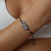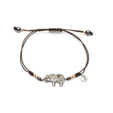 Sabiduría y fortaleza convertidas en amuleto: el elefante que te acompaña en cada paso. Así es esta pulsera. Una pulsera de nylon con bolas de plata bañadas en oro rosa y hematites con un elefante repleto de circonitas que te cautivará. Una pieza con mucho significado perfecta para elevar tus looks.