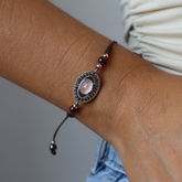 Elegante, con mucho carisma y súper combinable, así es esta pulsera. Una pulsera de nylon con bolas de plata bañadas en oro rosa y granates con una piedra semipreciosa de 6x8mm en el centro como protagonista y una orla de circonitas onduladas que acaban de darle un toque único de luz a la pieza. Perfecta para combinar.