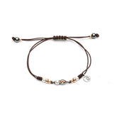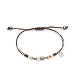 Sutileza y elegancia convergen en esta joya de forma exquisita. Una pulsera de nylon con bolas de plata bañadas en oro rosa y perlas con una perla y una circonita pera en el centro como protagonista. Una pulsera perfecta para combinar y darle un toque único a cualquier look de la temporada.