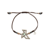 Como la grulla de papel japonesa, esta joya encierra un deseo de paz, amor y prosperidad. Una pulsera de nylon marrón con bolas de plata bañadas en oro rosa y hematites y en el centro, como protagonista, la silueta de una pajarita de plata repleta de circonitas y una piedra semipreciosa en el centro que acaba de darle un toque único a la pieza.