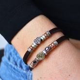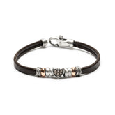 Elegante, romántica y con mucho carisma, así es esta pulsera. Una pulsera de cuero marrón de 5mm con un corazón pavé de circonitas como protagonista y entrepiezas de anillas de bronce y plata. Como un primer beso, así es nuestra Lovers Collection. Descúbrela.